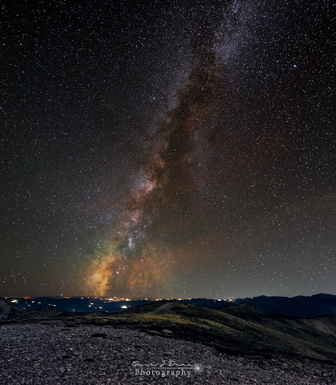 A wide-field nightscape capturing the view from Helmos Observatory, perched at an altitude of 2,300 meters above sea level in the mountains of Greece. Mountains and settlements dot the foreground underneath the brightest portion of the Milky Way's galactic core, which illuminates the surrounding valleys and peaks.